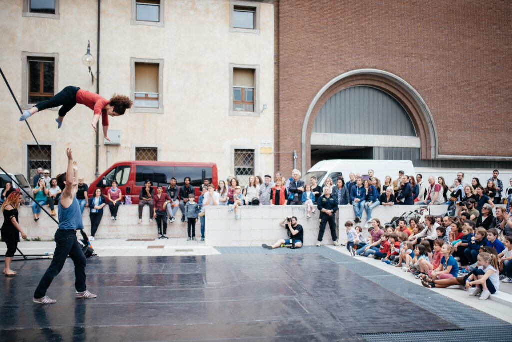 There is a He, commonly called Viso, and there is a She, Rachel, the smallest and curliest of the pair. Using subtle physical comedy, the two find themselves having (or wanting) to engage with one another and experiencing the space-time rhythms of their slowed-down fragility. A corporeal dialogue that uses circus language as each playfully attempts to discover the other’s weaknesses and qualities. The duo is made up of Davide Visintini and Giulia Racca, a couple who individually are a juggler and aerial acrobat.